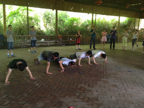 來(lái)到美麗的山莊,大家先在拓展老師的帶領(lǐng)下,來(lái)到了荔枝園中的一片空地上,大家圍成一圈,做起了歡快的小游戲,這些小游戲充分地體現(xiàn)了團(tuán)隊(duì)間的相互幫助、相互合作的精神。當(dāng)然,游戲中的失敗者還是有些小小的懲罰。